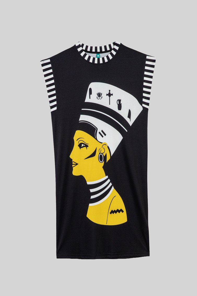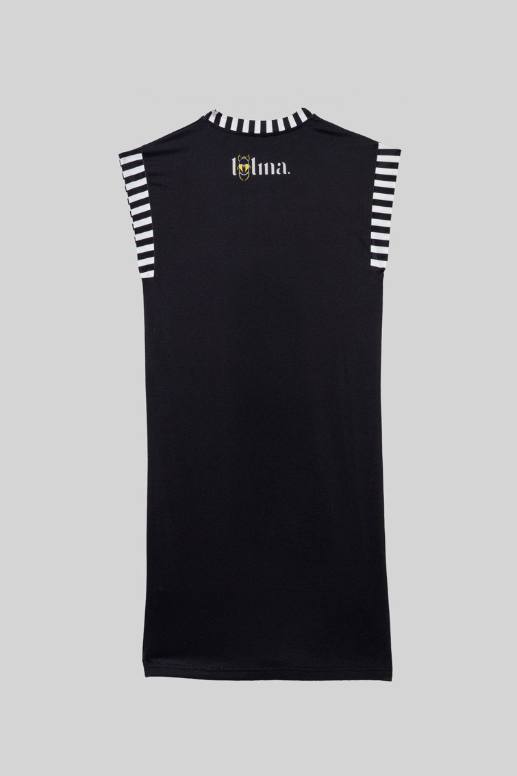 Μαύρο βαμβακερό μίνι φόρεμα με ριγέ τελείωμα και λεπτομέρεια φαραώ: