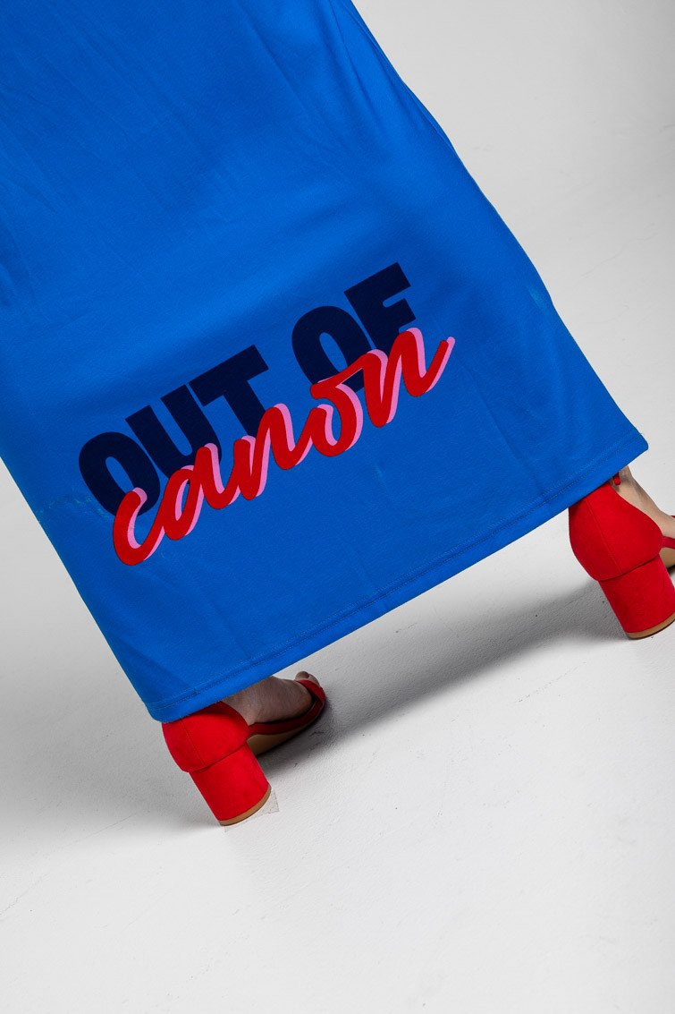 Μακρύ μπλε φόρεμα με αθλητική πλάτη και κλασικά ροζ και κόκκινα γλυπτά- Rompe el molde