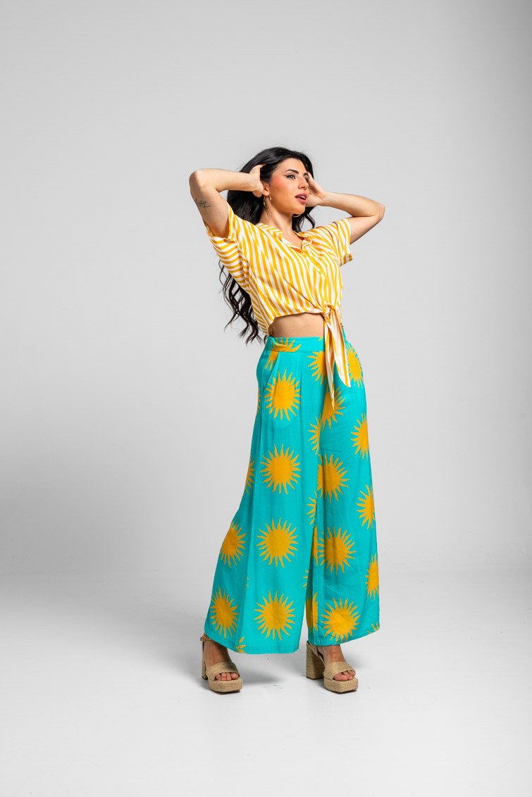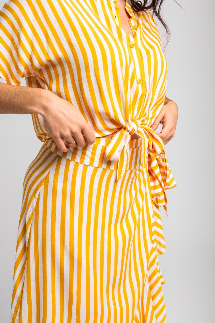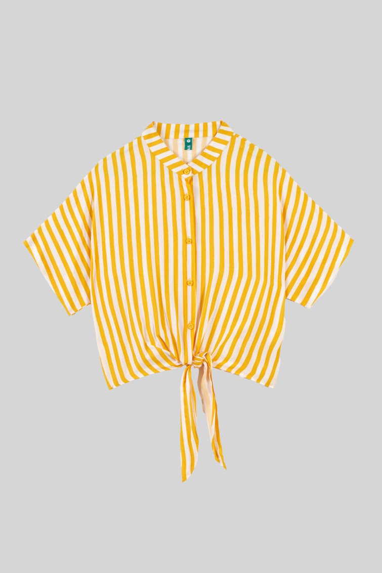 Λευκό και κίτρινο ριγέ πουκάμισο με γιακά μανταρινιού και δέσιμο στο ντεκολτέ.
