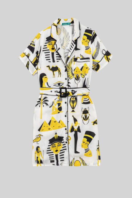 Κοντό φόρεμα-πουκάμισο με λευκό τελείωμα και αιγυπτιακά στοιχεία -La Faraona