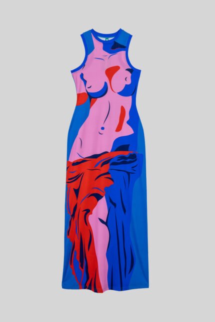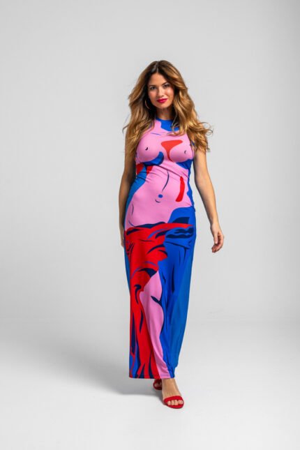 Μακρύ μπλε φόρεμα με αθλητική πλάτη και κλασικά ροζ και κόκκινα γλυπτά- Rompe el molde