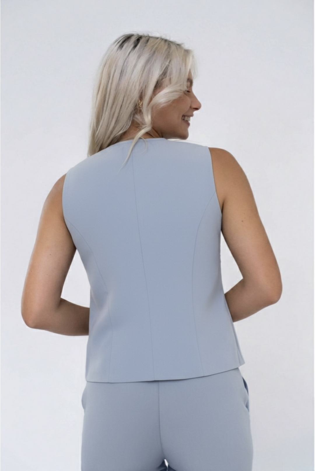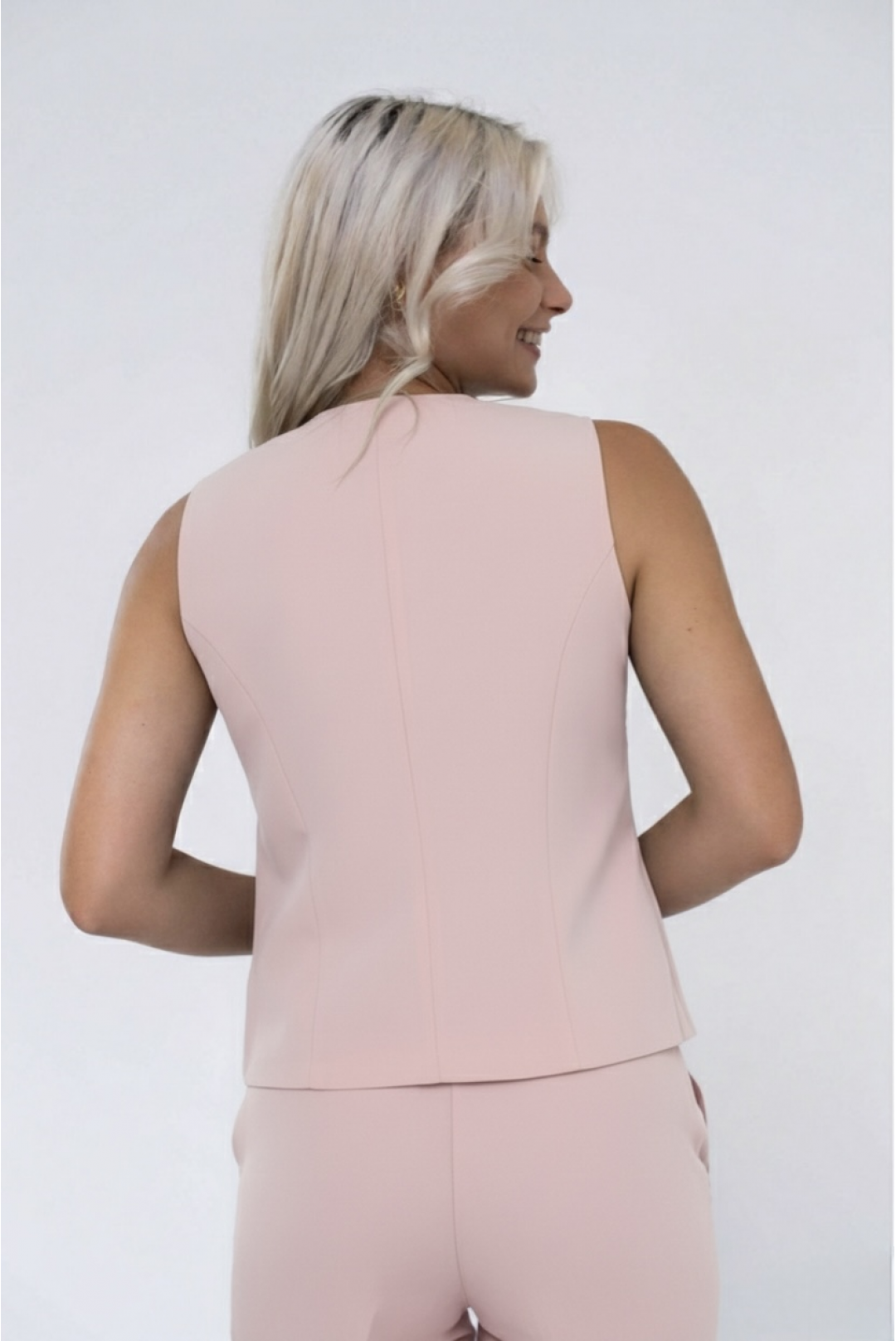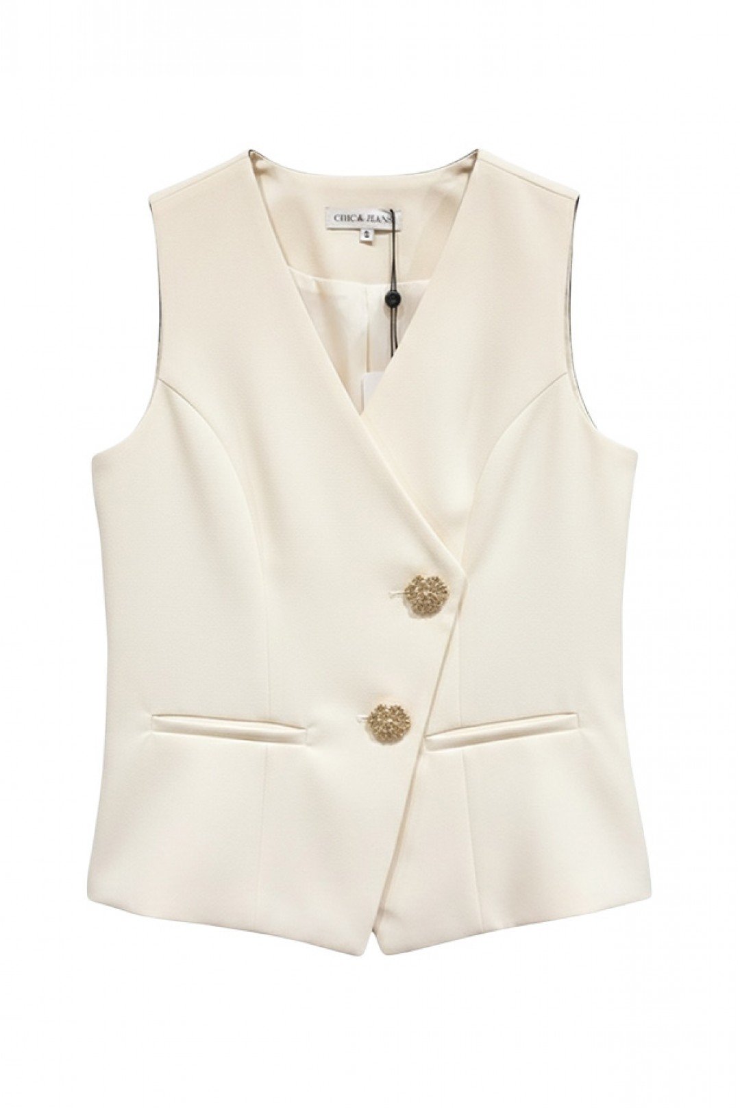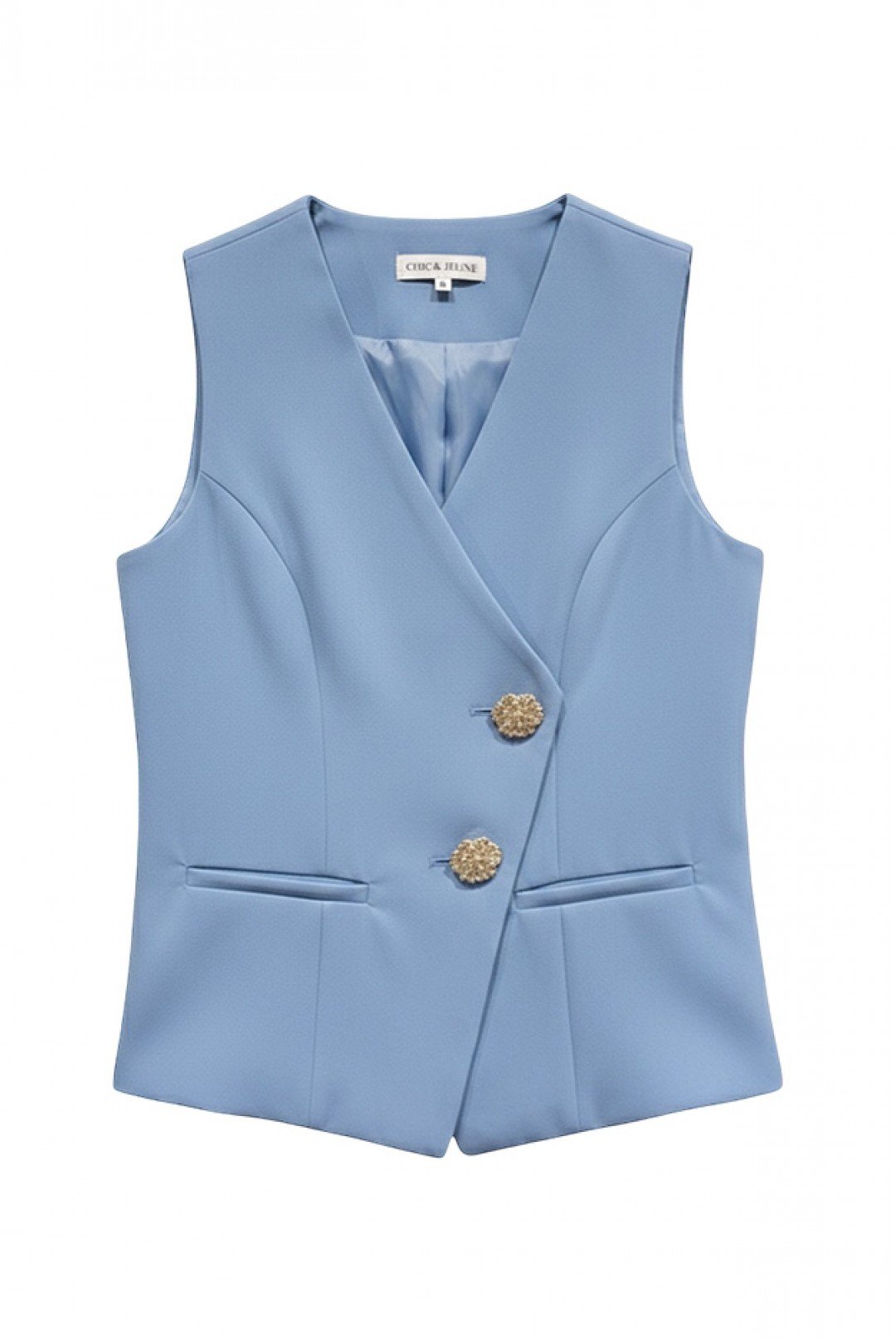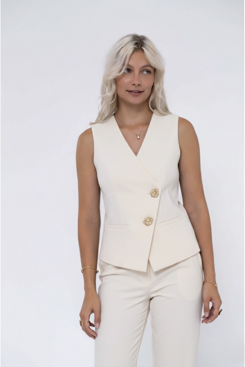 Αμάνικο γιλέκο με χρυσά κουμπιά σε σχήμα λουλουδιού - ένα κομψό και δομημένο κομμάτι που προσδίδει μια εκλεπτυσμένη και θηλυκή πινελιά στα σύνολά σας.