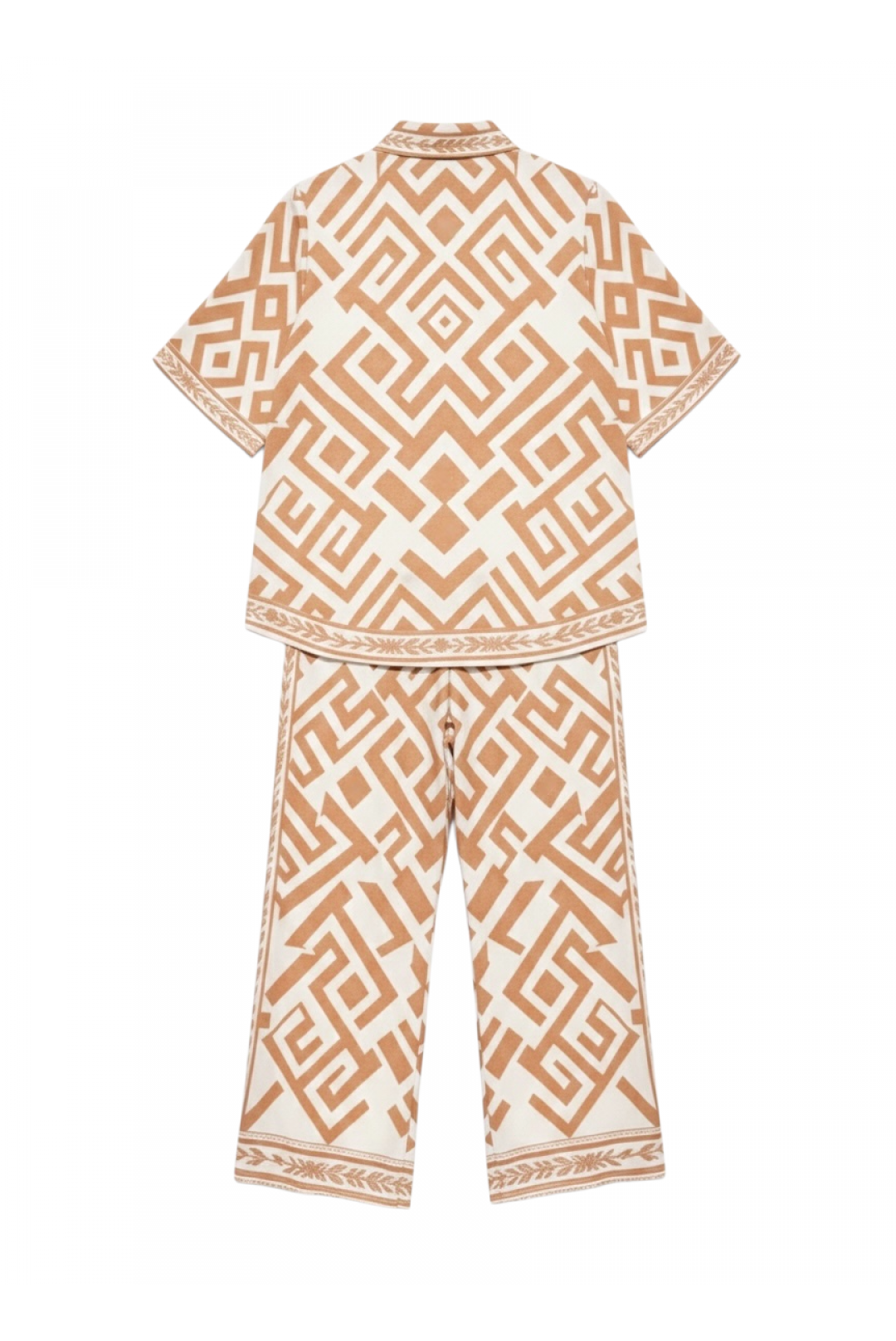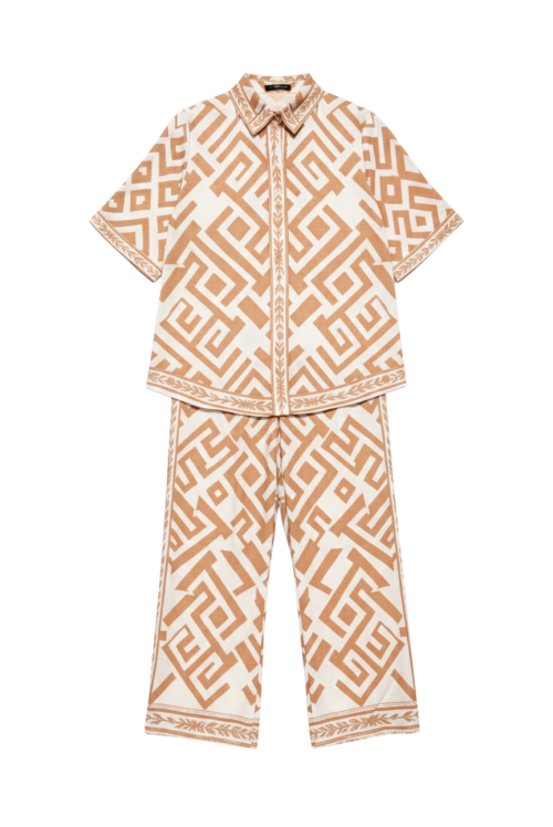 Ανακαλύψτε την αβίαστη κομψότητα με αυτό το όμορφο, αέρινο σύνολο, που αποτελείται από ένα ελαφρύ κοντομάνικο πουκάμισο και ένα φαρδύ παντελόνι διακοσμημένο με ντελικάτα σχέδια και περίτεχνα τελειώματα.