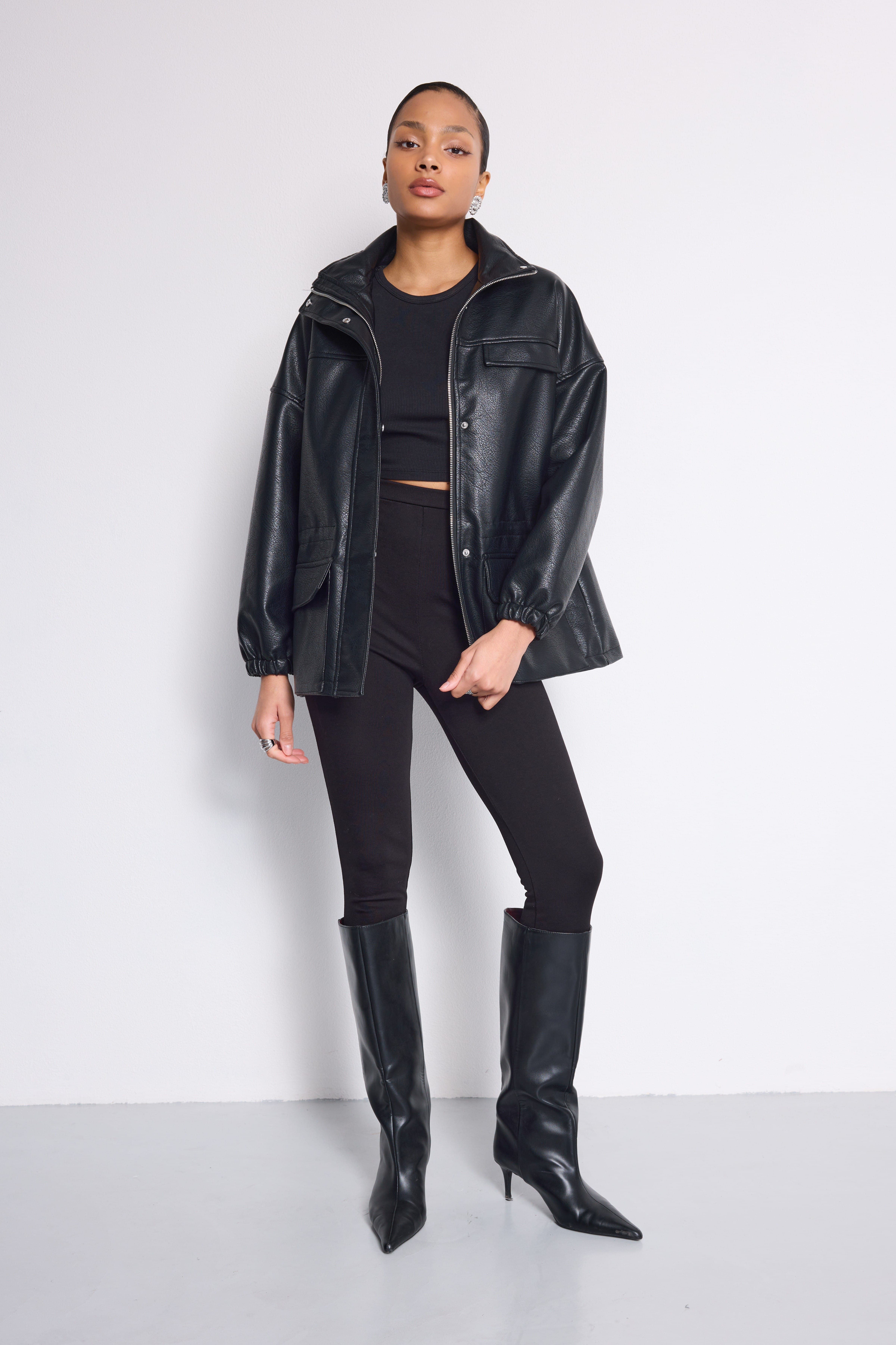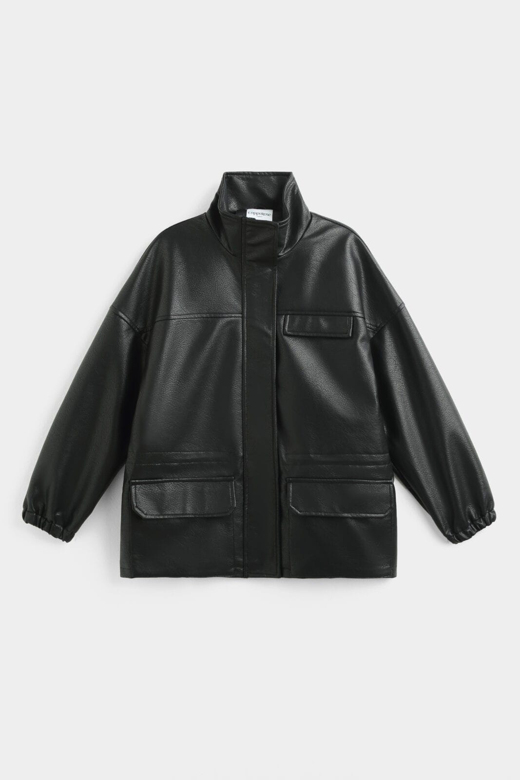 Μπουφάν από συνθετικό δέρμα. Ψηλός γιακάς και μακριά μανίκια με λάστιχο. Τσέπες με κουμπιά. Λάστιχο στη μέση. Εσωτερική επένδυση στο ίδιο χρώμα. Κλείσιμο μπροστά με φερμουάρ που κρύβεται από λάστιχο με τρουκς. Σύνθεση : 92% Polyester 7% Cotton 1% Viscose.